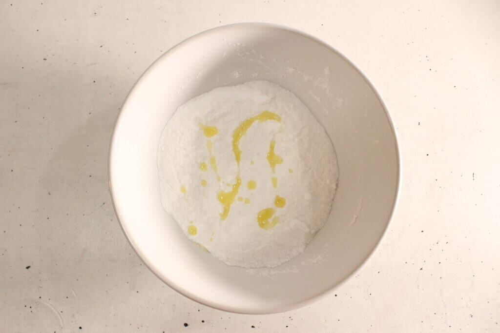Slowly pour your almond oil mixture into the dry ingredients while stirring continuously. Then, using your spray bottle, spritz a bit of water at a time (about six sprays worked for me) until the mixture starts to clump together like damp sand. It should hold its shape when you squeeze it not crumble apart.