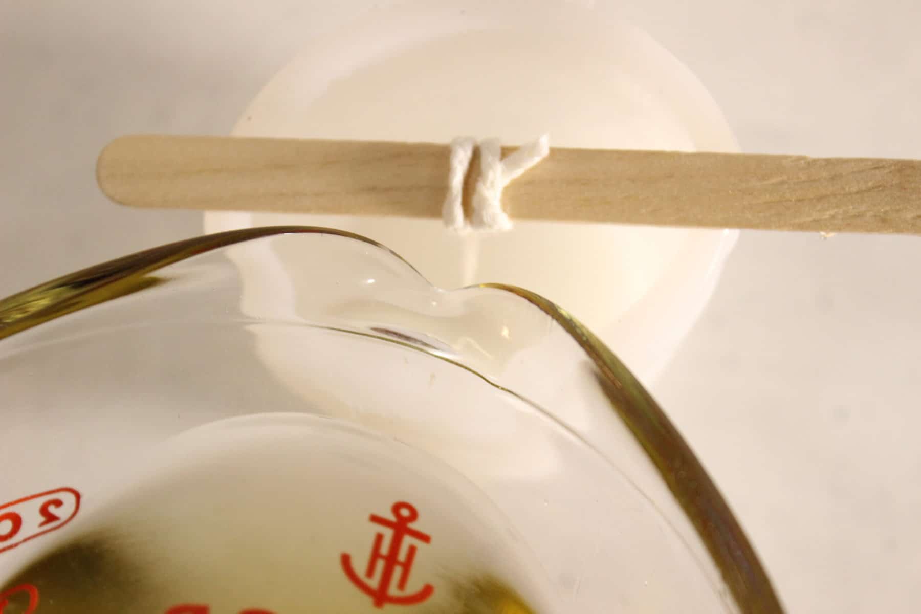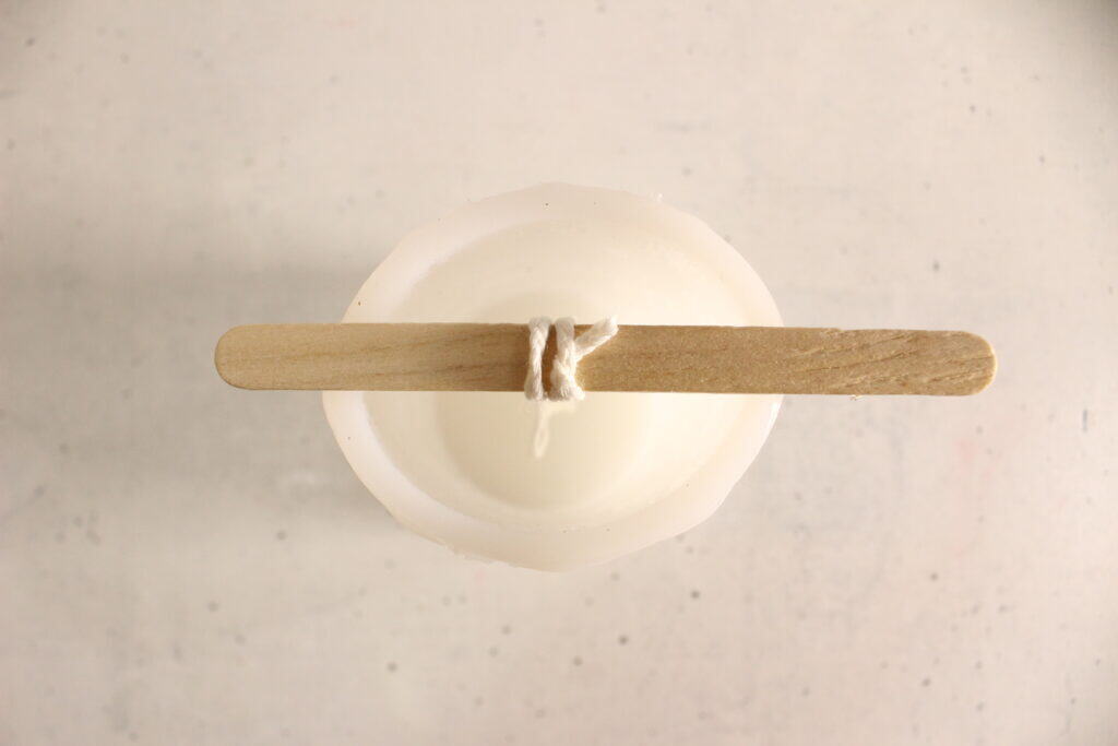 Attach the cotton wick to a popsicle stick and lay it across the top of your candle mold so that the wick stays centered.