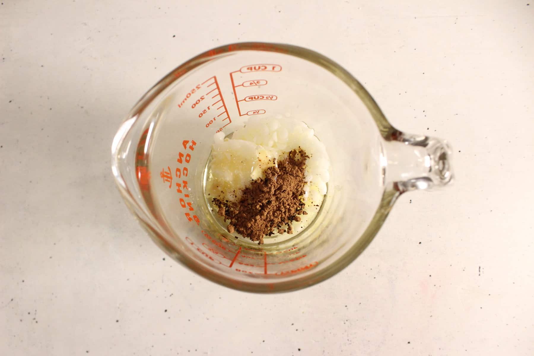 - In a double boiler, combine the beeswax, coconut oil, cocoa butter, castor oil, cocoa powder, and jojoba oil. Heat gently until fully melted and smooth.