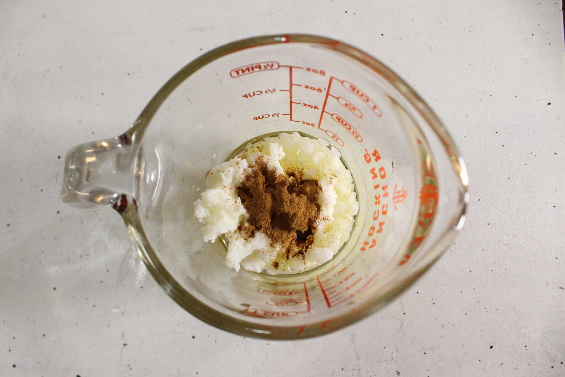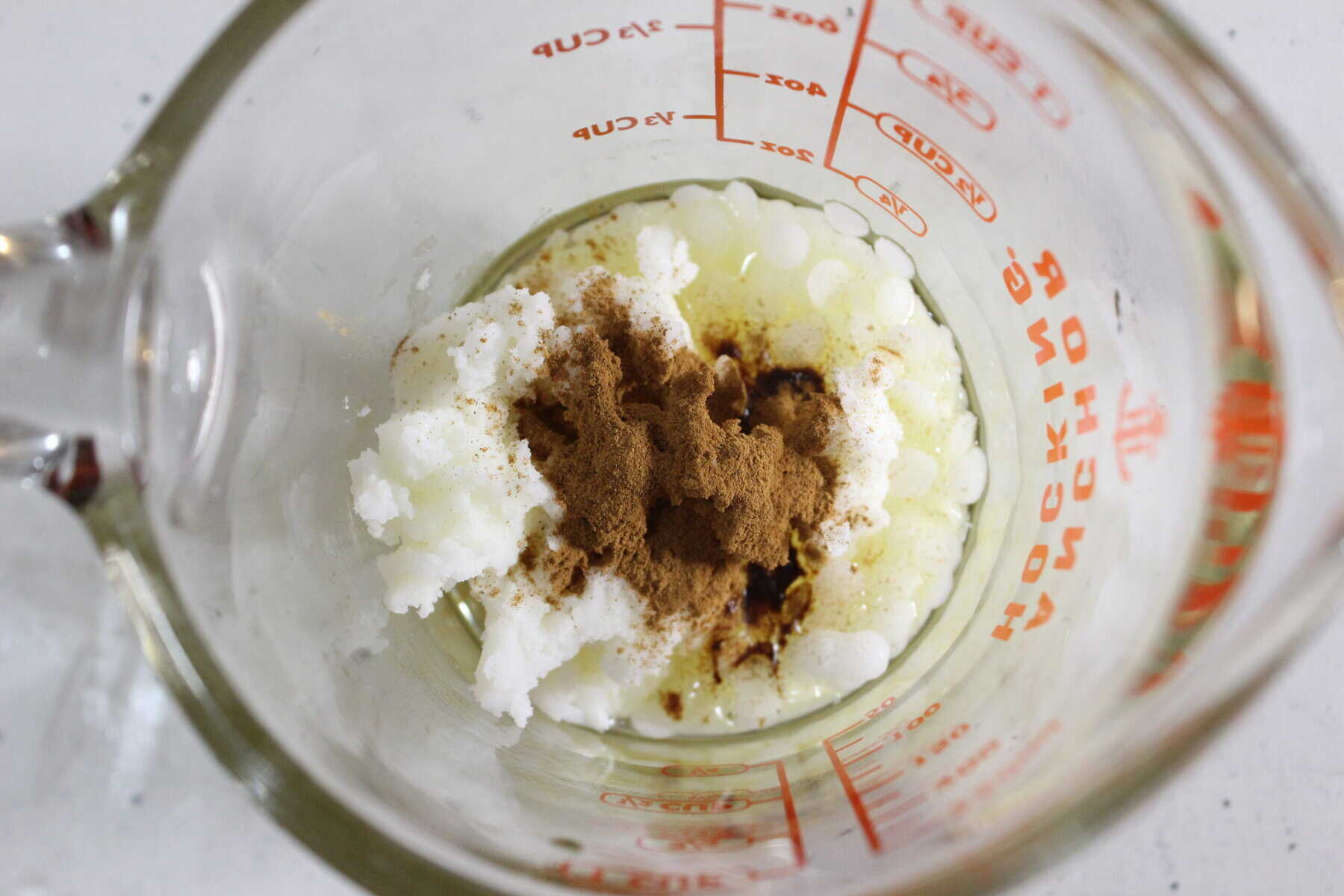 - In a double boiler, melt the beeswax, carrier oil, coconut oil, and ground cinnamon together until fully liquefied. Stir occasionally to keep the cinnamon from clumping.